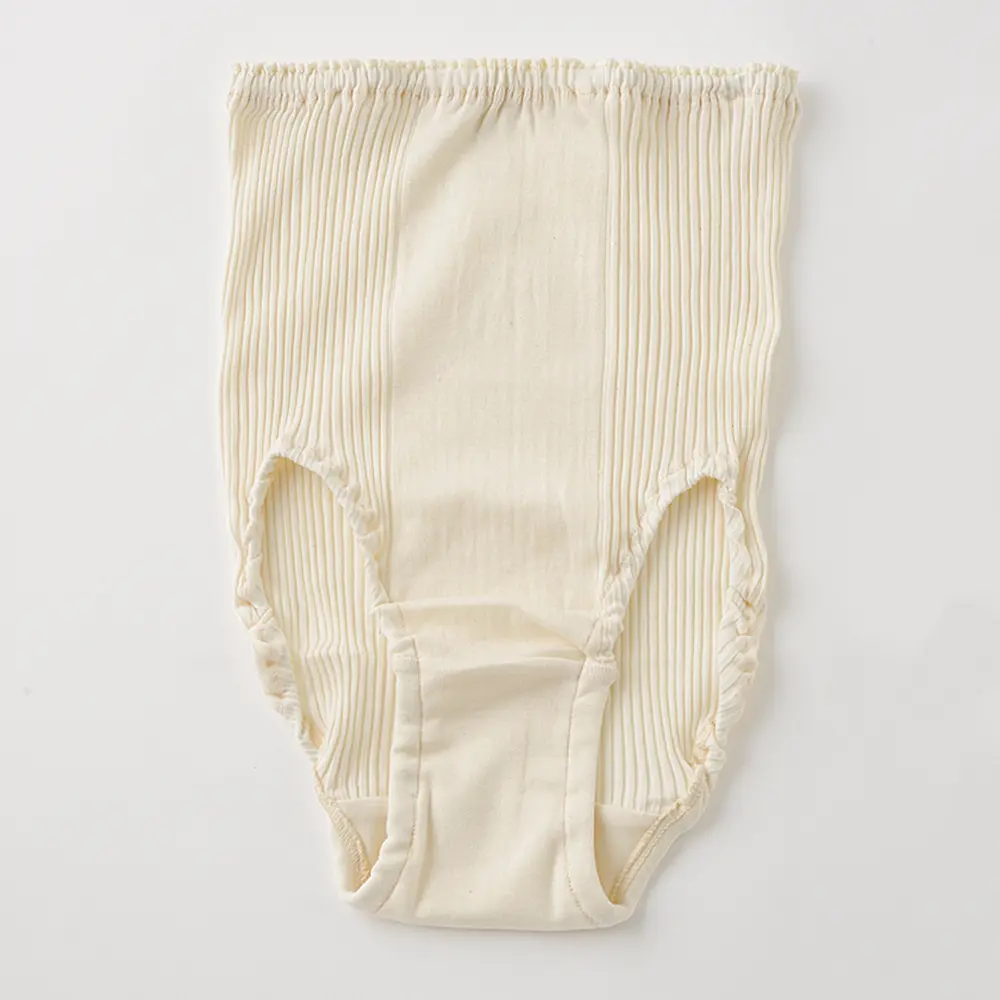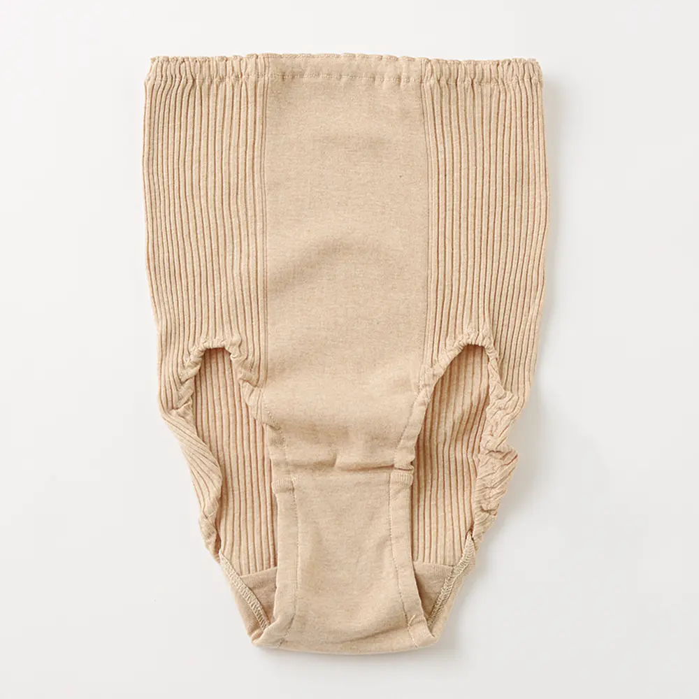 商品説明:前にフライス編み、横から後ろはリブ編みで体に沿ってヒップをすっぽり包みます。背中側にゴムの取り替え口がついています。縫い糸もオーガニックコットンを使用しています。